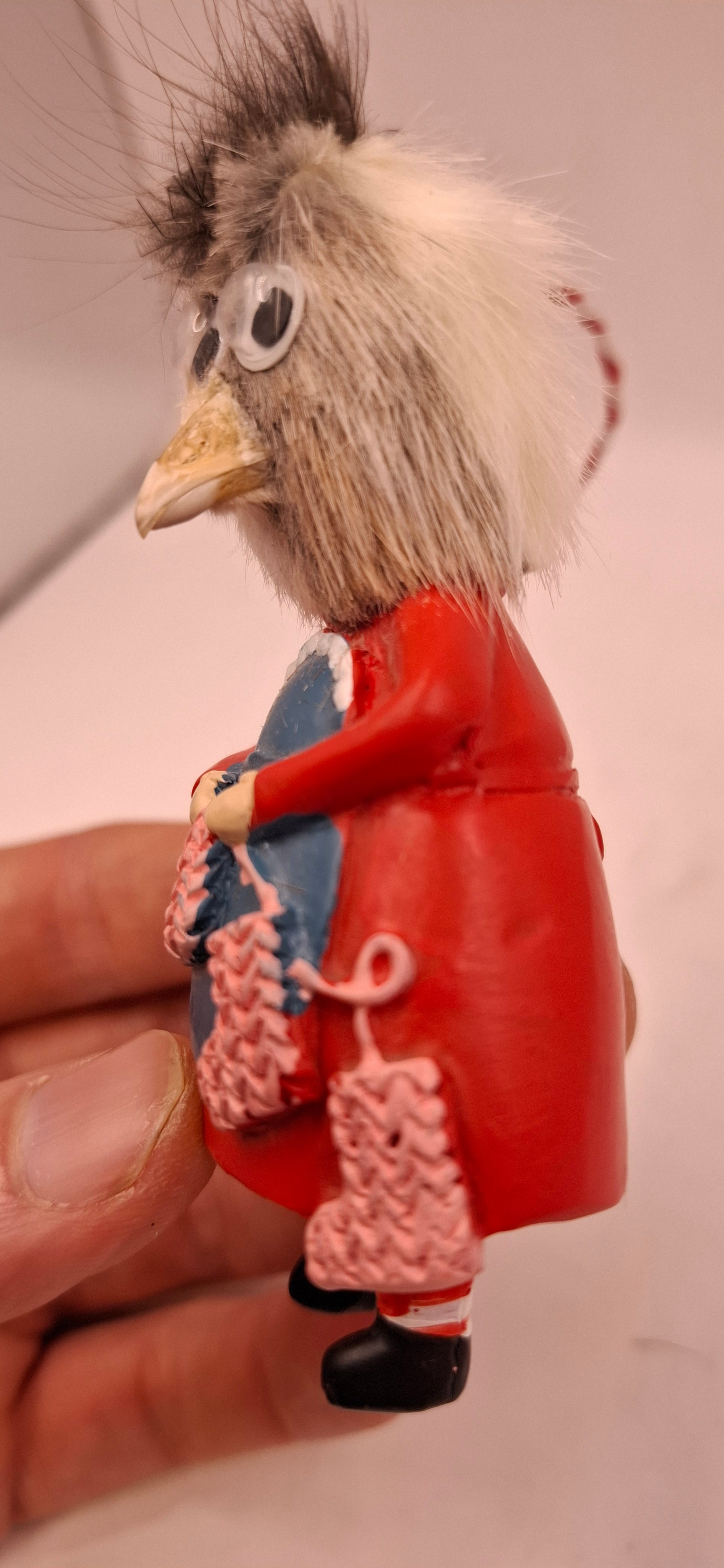No actual claws, just a head made out of rat Skin on a dumpy bodied women in a red dress.